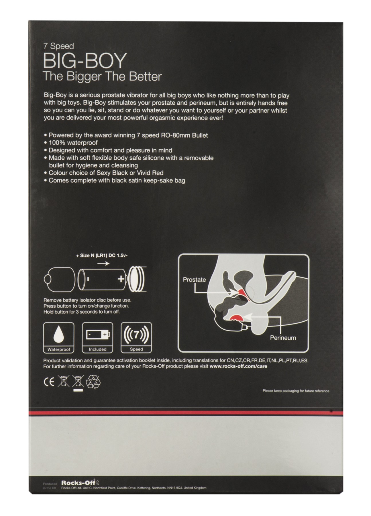 Массажер простаты Big-Boy изготовлен из эластичного и мягкого силикона, который используется в медицине, не вызывает аллергии и безопасен для мужчины. Функция вибрации включается одним нажатием, вибрация бесступенчатая и очень тихая. Для безболезненного введения массажера рекомендуется использовать Big-Boy со смазкой на водной основе.