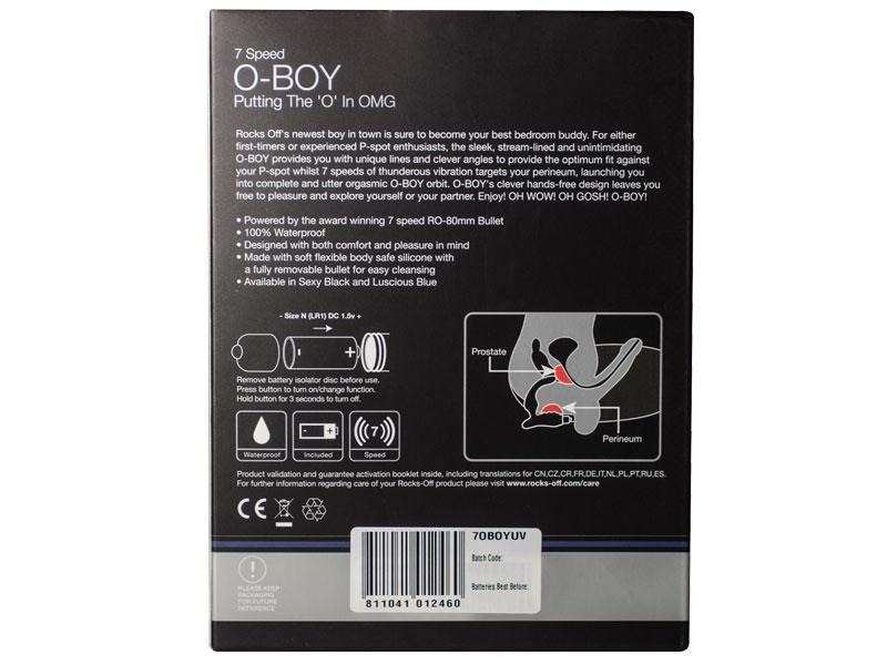 Массажер простаты Rocks-off O-Boy сделан с учетом всех анатомических деталей, а значит подойдет для любого мужчины, который хочет улучшить свое интимное здоровье или увеличить мужскую силу. Его уникальная форма, качественный медицинский силикон, а также мощный виброэлемент делают его привлекательным даже для пользователей с большим опытом. Новая форма массажера простаты Rocks-off O-Boy немного отличается от других моделей массажеров. За счет небольшого выступа нижней части увеличена площадь массажа от сфинктера в сторону копчика для наиболее ярких и приятных ощущений. Помимо этого выступа является ограничителем и препятствует излишне глубокому проникновению внутрь. Как и другие модели Rocks off, O-Boy имеет семь режимов вибрации.