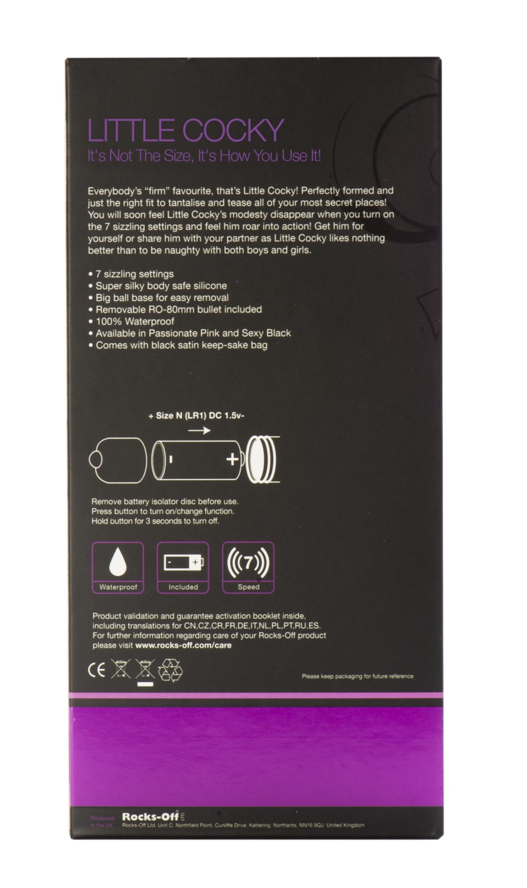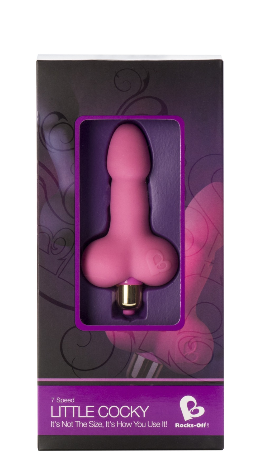 Rocks-Off Little Cocky — невероятный вибростимулятор из нежнейшего силикона. Выполнен в виде пениса с ярко выраженной головкой и яичками. Имеет 7 режимов вибрации, которые можно легко переключать кнопкой у основания вибратора. Очередной плюс Little Cocky в том, что он водонепроницаемый. Его можно использовать во время водных процедур в ванной или душе. Данный анальный стимулятор довольно универсален, подойдёт как мужчинам, так и женщинам. Little Cocky простимулирует все эрогенные зоны, подойдёт как для анальных игр, так как имеет ограничитель, так и для вагинальной стимуляции. Для наиболее комфортного использования рекомендуется использовать смазку на водной основе.