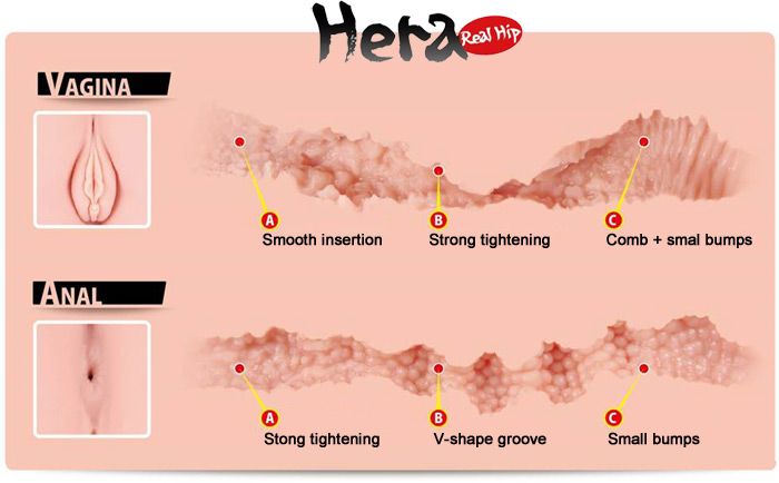 Два рабочих отверстия реалистичного мастурбатора попки Kokos Hera Hip Real - вагина и анус - имеют уникальную текстуру, которая идентична настоящей текстуре вагины и ануса. Анальный канал, полностью покрытый пупырышками, имеет пять сужений, которые подарят приятную тесноту и тугость. Вагинальный канал реалистичного мастурбатора попки Kokos Hera Hip Real так же покрыт бугорками, но они имеют более разнообразные размеры и создают совершенно другие ощущения. Для экстра стимуляции члена в вагине предусмотрена точка G, а так же поперечные складки в конце канала.