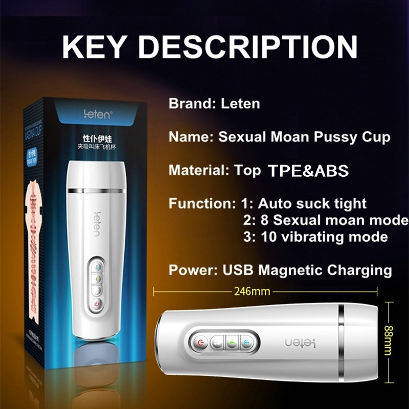 Leten EVA vagina cup - высокотехнологичная игрушка, которая помимо вибрации и голоса, также обладает функцией автоматического сжатия и умеет реагировать на силу и частоту ваших фрикций. 10 режимов вибрации, 8 режимов сжатия, 8 вариантов сексуальных стонов японской порноактрисы - выберите что-то одно или скомбинируйте всё вместе. Внутренний рукав мастурбатора Leten EVA vagina cup изготовлен из нежного и бархатистого на ощупь эластомера. Для придания большей реалистичности, вход в мастурбатор украшен аккуратными половыми губами, сделанными по слепку настоящей вагины. Игрушка обладает богатой внутренней структурой: множество переходов, выступов, впадинок и ребрышек обеспечивают интенсивную стимуляцию в процессе использования.