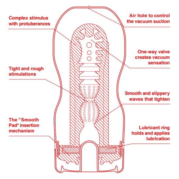 Специальные камеры с клапанами при использовании создают перепады давления. С помощью отверстия на конце мастурбатора можно регулировать силу всасывания.