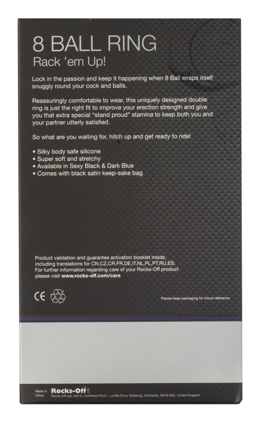 Эрекционное кольцо Rocks Off 8 Ball выполнено в виде двух колец в форме восьмерки, которые надеваются на пенис и мошонку одновременно. Изготовлен из мягкого силикона, который легко растягивается до любого размера. Наденьте меньшее кольцо на основание пениса - это затруднит отток крови и продлит эрекцию.