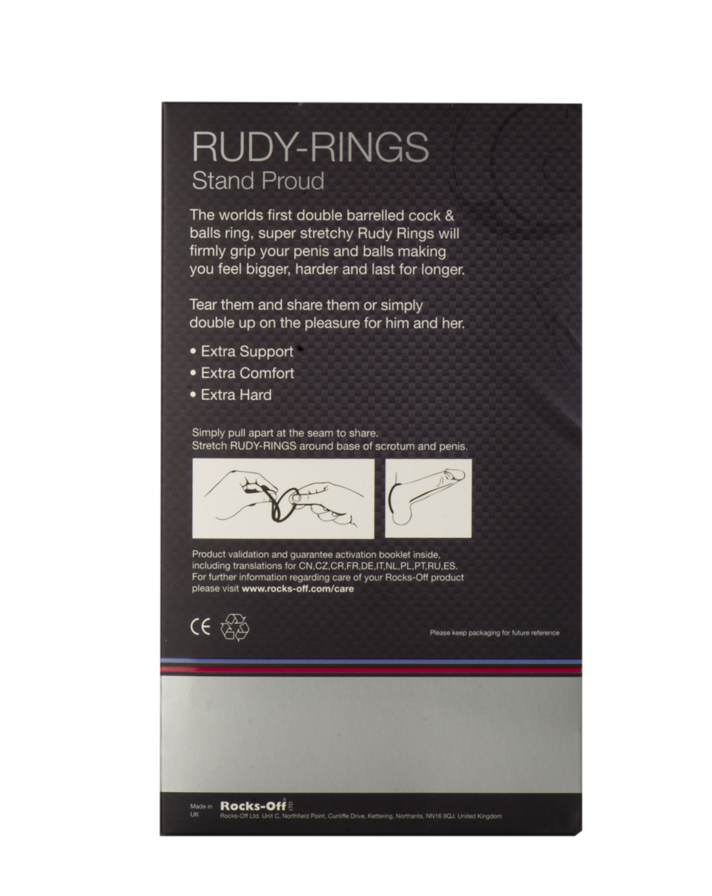 Эрекционное кольцо Rudy-Rings выполнено в виде двух парных колец, которые надеваются на пенис и мошонку одновременно. Изготовлено из мягкого силикона, который легко растягивается до любого размера и является полностью безопасным для здоровья. Наденьте одно кольцо на основание пениса - это затруднит отток крови и продлит эрекцию. Сжатие мошонки вторым кольцом обострит мужские ощущения, подарив больше впечатлений.