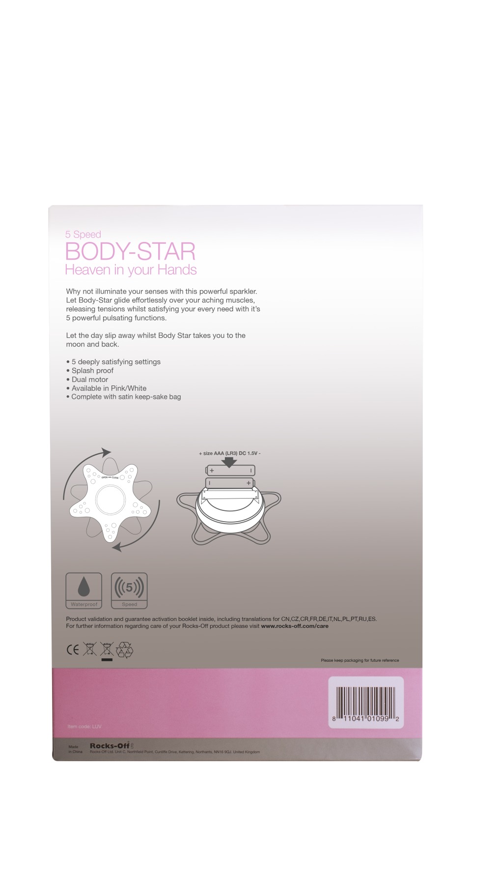Отличное решение для хорошего завершения тяжелого дня - это приятных массаж всего тела от любимого человека. С таким великолепным массажером для тела как Rocks Off Body-Star вся усталость быстро уйдет. Это отличный вариант для тех, кто хочет уединиться, расслабиться и получить удовольствие. Для более приятных ощущений на уголках вибратора есть небольшие пупырышки, которые отлично массажирую вашу кожу. Body-Star предлагает 5 режимов вибрации, которые легко переключаются кнопкой на корпусе.