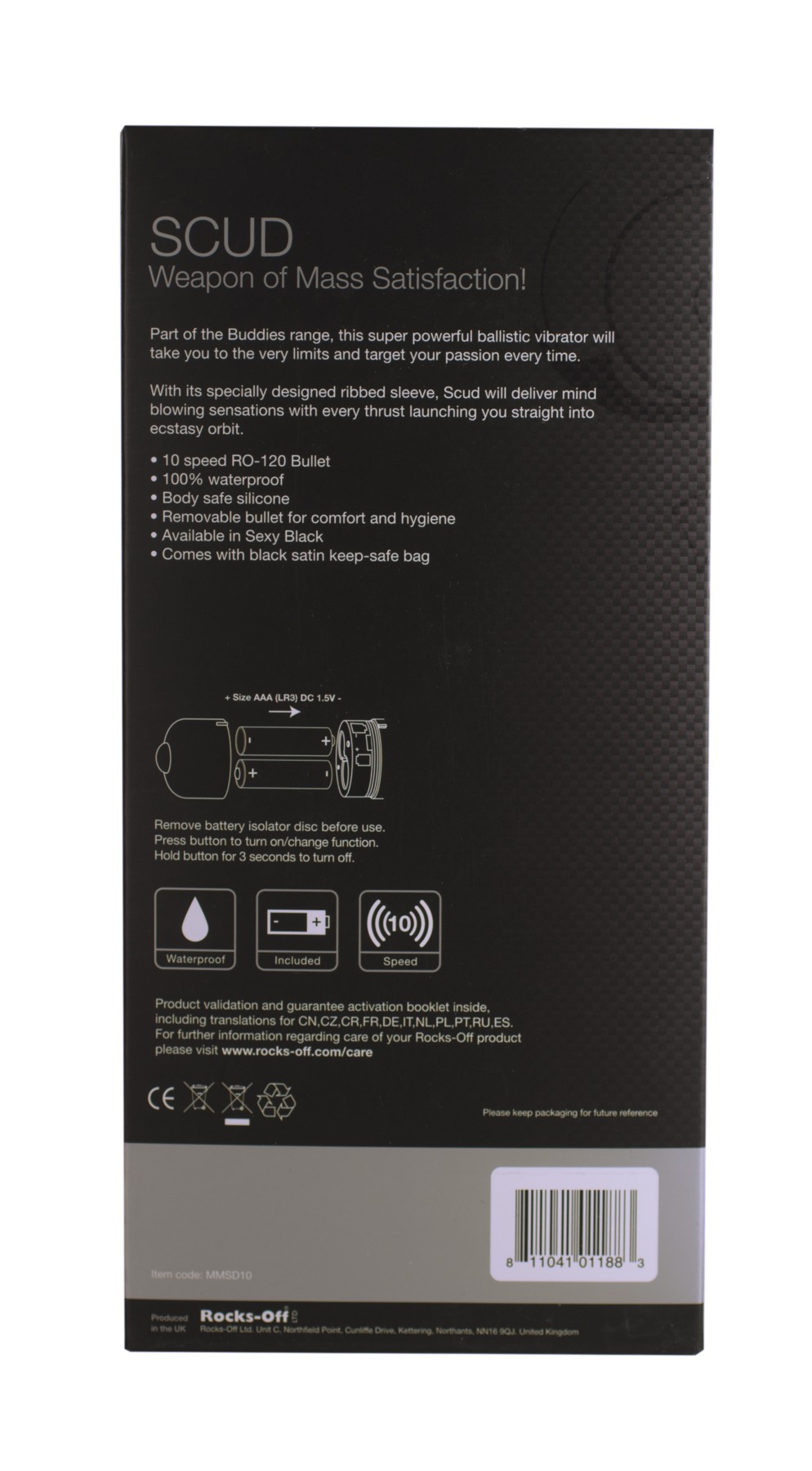 Вибратор Rocks Off Buddies Scud сделан из медицинского силикона, что делает и грушку полностью безопасной для здоровья. Работает от 2 батареек типа ААА.