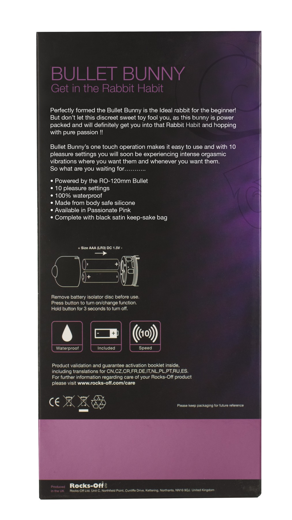Rocks-Off Bullet Bunny выполнен из пластика и покрыт медицинским силиконом, приятным на ощупь и абсолютно безопасным для здоровья. Благодаря мощной вибропуле RO-120mm, вибрация игрушки при ее небольших размерах будет очень мощной и впечатляющей. Имеет 10 режимов вибрации. Переключаются режимы кнопкой на основании игрушки. Модель полностью водонепроницаема.